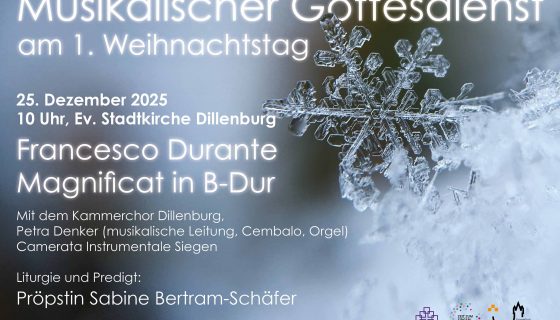 Musikalischer Gottesdienst mit Magnificat von Francesco Durante am 25. Dezember Mit festlicher Musik feiert die evangelische Kirchengemeinde Dillenburg den ersten Weihnachtstag: Im Gottesdienst am 25. Dezember um 10 Uhr in […]