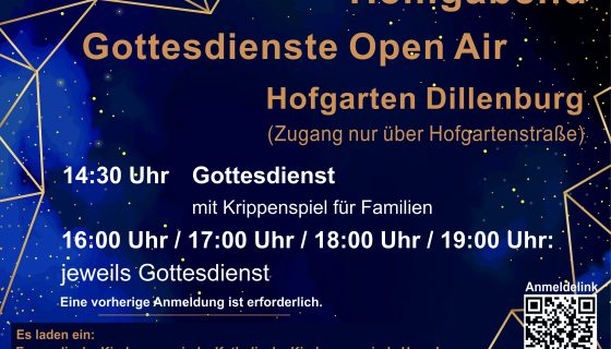 Open-Air-Gottesdienste am 24.12.Am 24.12. wird es ab 14:30 Gottesdienste geben. Ab jetzt sind Anmeldungen möglich über die Gemeindebüros der ev. Kirchengemeinde, kath. Pfarrgemeinde Herz Jesu und die Freie Gemeinde Dillenburg […]