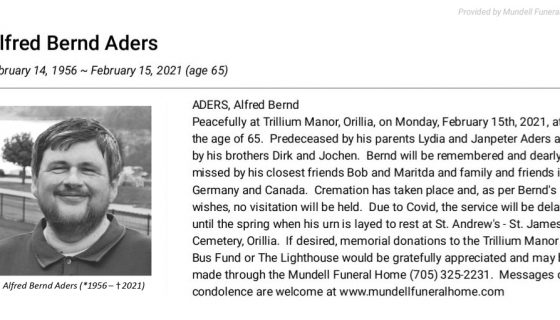 Trauer um Herrn Bernd Aders, einen großen Gönner unserer Ev. Kirchengemeinde In Kanada verstarb am 15. Februar, kurz nach seinem 65. Geburtstag,Herr Bernd Aders. Er stammte aus Dillenburg und war […]