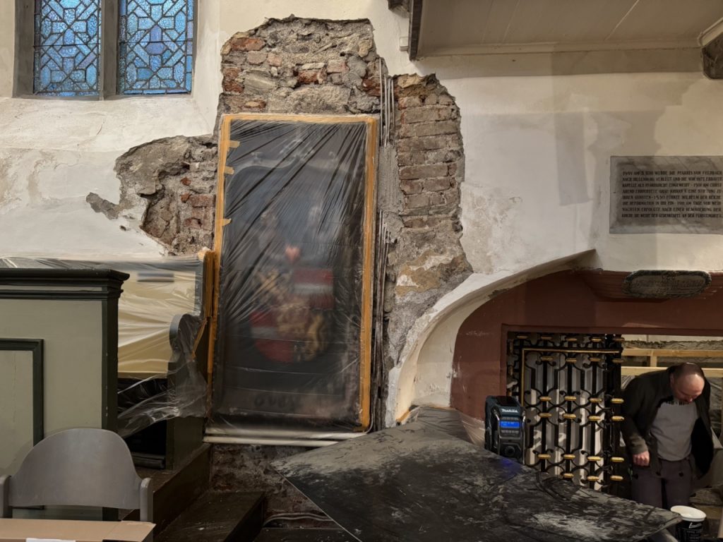 Bald wird der Putz wieder aufgebracht und mit denkmalschutzgerechter Farbe gestrichen.