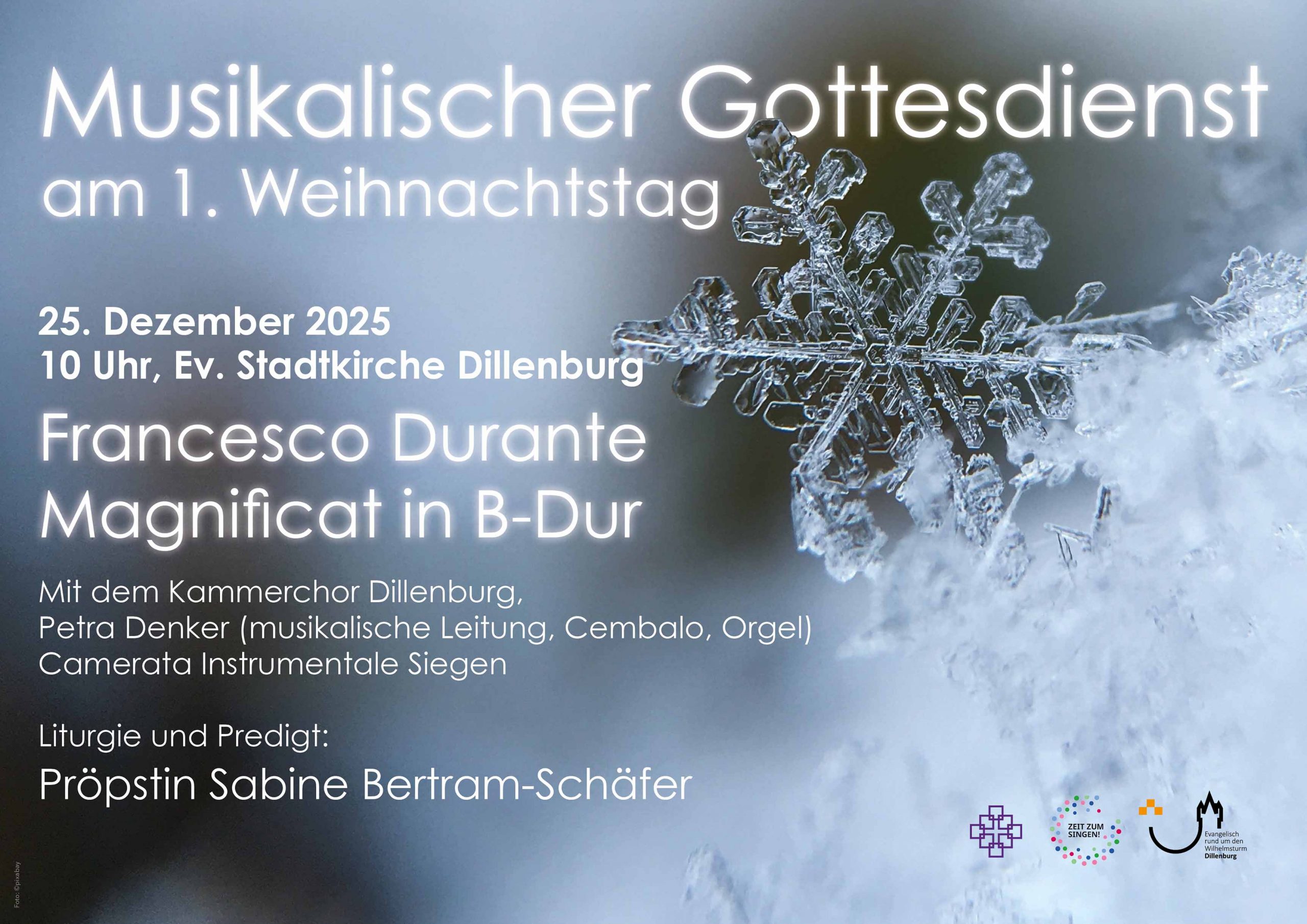 Mit festlicher Musik feiert die evangelische Kirchengemeinde Dillenburg den ersten Weihnachtstag: Im Gottesdienst am 25. Dezember um 10 Uhr in der evangelischen Stadtkirche erklingt das Magnificat in B-Dur des italienischen Barock-Komponisten Francesco Durante. An verschiedenen Stellen des Gottesdienstes fügen sich die Sätze harmonisch in den Ablauf ein. Es singt der Kammerchor Dillenburg unter Leitung von Petra Denker, instrumental begleitet von camerata instrumentale Siegen. Die Liturgie und Predigt verantwortet Pröpstin Sabine Bertram-Schäfer.