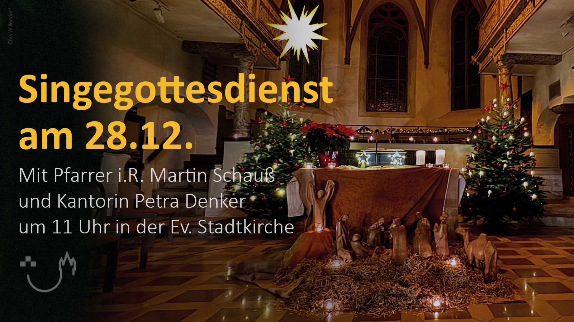 In diesem Jahr gibt es erstmals einen Singegottesdienst zwischen den Jahren: Im Gottesdienst am 28. Dezember um 11 Uhr wollen wir viele bekannte Weihnachtslieder singen. Kinder, Familien und alle, die mögen sind herzlich zu diesem fröhlichen Gottesdienst mit Pfarrer Martin Schauß und Kantorin Petra Denker eingeladen!